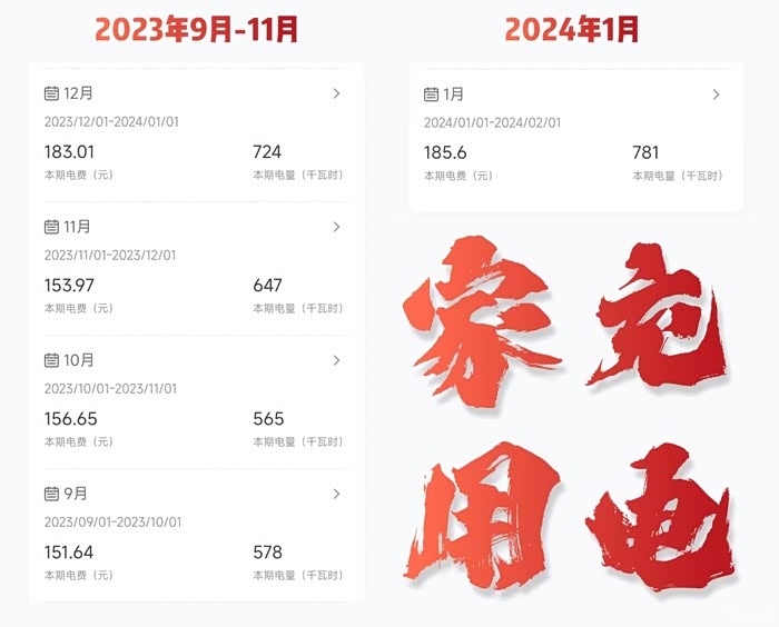 自2023年9月至2023年12月止,共计充电:2514度电,共计花费645.27元。2024年1月,共充电781度,共计花费:185.6元。 家充总共充电:3295度电。 共花费830.87元 。