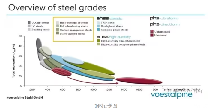 注意,热成型钢不仅包括抗拉强度达1500Mpa以上的硼钢,也包含抗拉强度约为500-600Mpa的热成型拼焊非硼钢。从香蕉图上可以看出这点。同时我们把PHS、UHSS、AHSS统称为高强度钢,这些钢材一般应用于车身安全的关键部位。