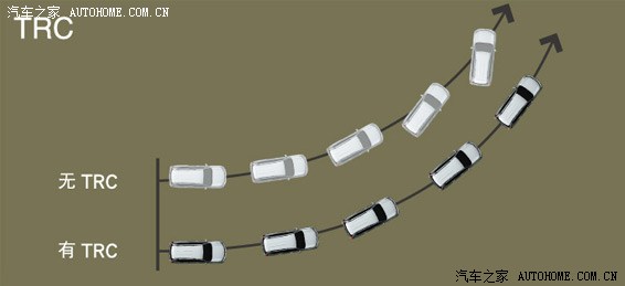 车辆在冰雪等湿滑路面急起步或急加速时,车轮易发生空转。TRC能够通过传感器感知车辆在起步或行驶过程中驱动轮发生空转的情况,并控制驱动轮制动及发动机动力输出,提供最恰当的驱动力,防止驱动轮发生空转,提高湿滑路面上的行驶安全性。
