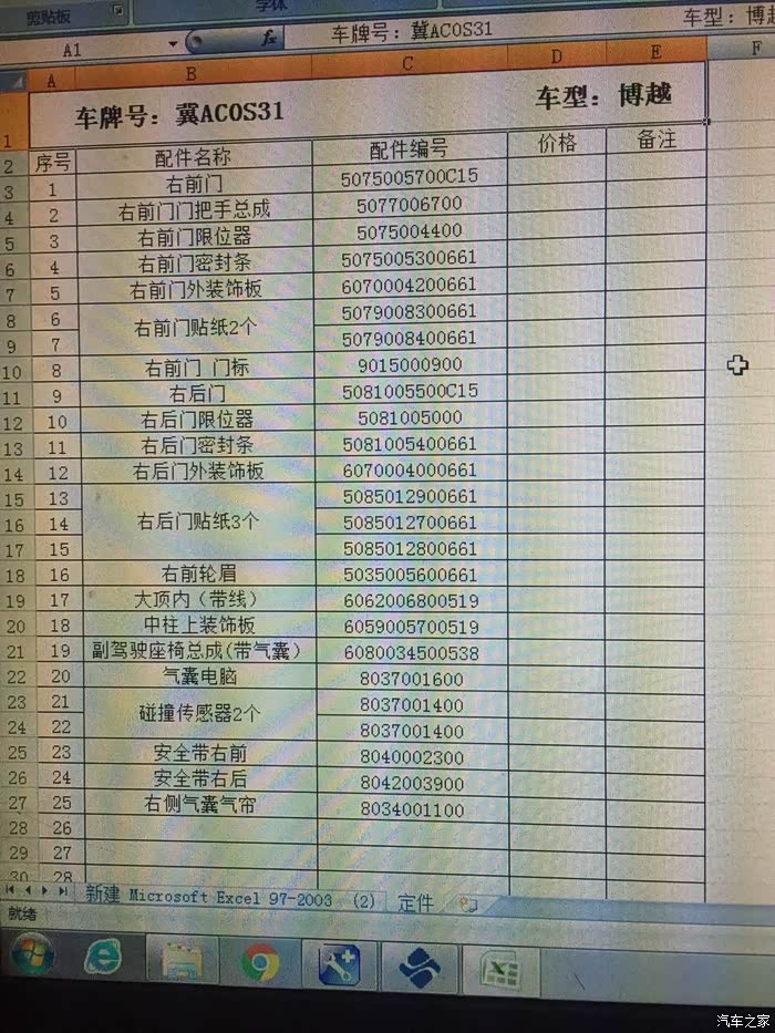 听别人说要等件加修得半年时间,得花三万多,我的心在滴血。回家上网搜搜有谁修过博越,花了多钱多长时间。还真找到一个,链接你们自己去找,齐齐哈尔的大哥,被撞的比我惨,估计了一下修了两个月,花了4w+。心里有了底了。