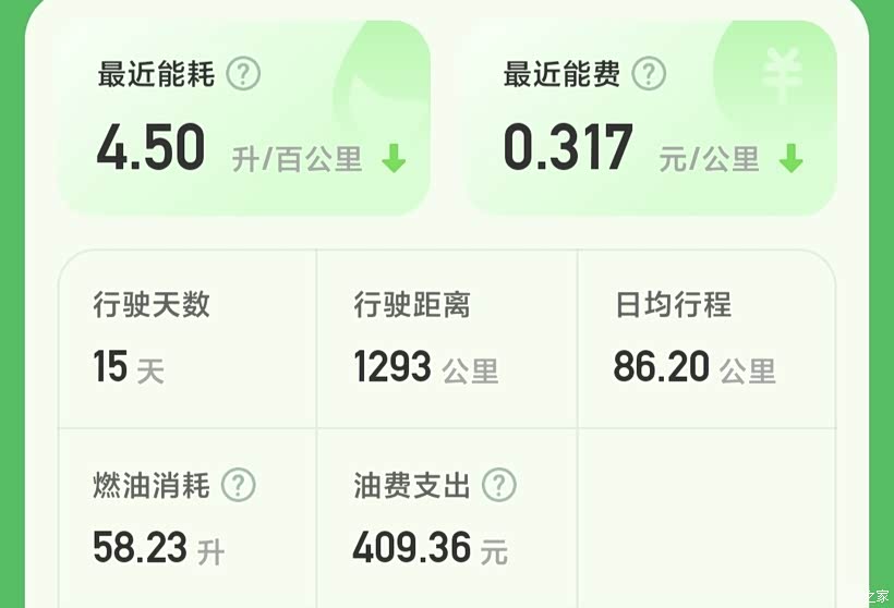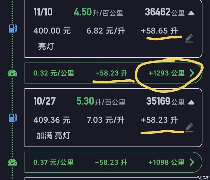 上次加油58升这次还是加油58升,行驶1293公里,油耗数据不受加油量变化干扰