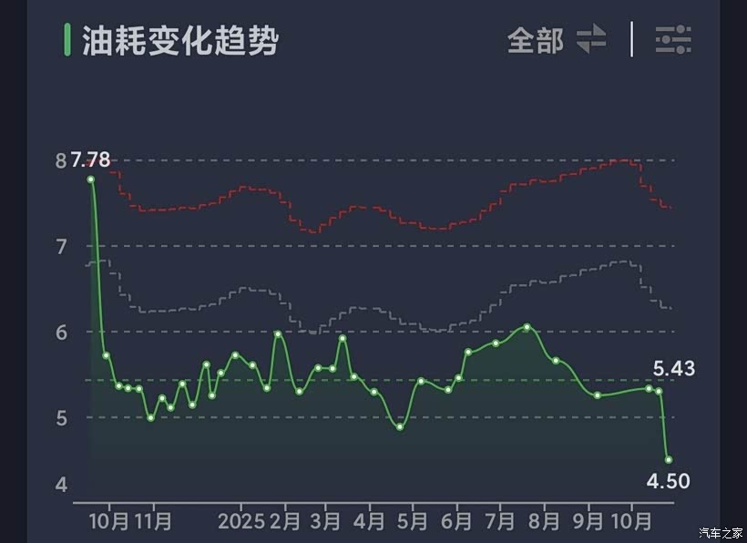 提车以来所有加油数据曲线,上面两条虚线是本市赛那高位和低位油耗曲线 相同路况和气温下,常年比本市高位均值低两个,比低位均值低一个