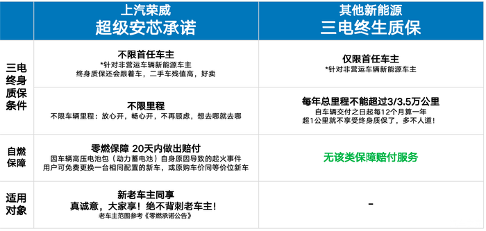 为了把诚意拉满,为了让消费者们获得真正的高价值权益,7月4日,上汽荣威正式发布“超级安芯承诺”,囊括业界最高标准的“零燃保障”和“三电终身质保”承诺。荣威不仅取消了里程限制,还增添了车主回溯效力等创新举措,真正实现了让用户“放心买、安心用”的承诺。