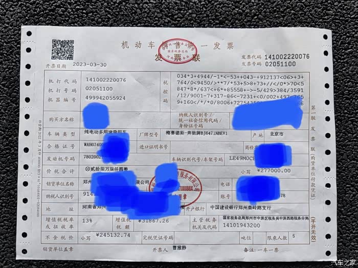 2023款比2022款多了个电动尾门、自适应巡航和绿色充电(据说是用奔驰充电桩才能用绿色充)。赶上第一季度优惠力度,3年0息0手续费,裸车28.2w拿下,送5000的装潢(太阳膜,脚垫子,行车记录仪),1000上牌费,但发票显示车价是27.7w,相当于捆绑销售5000的装潢。如果不要装潢,发票会开成28.2w,但总价不会便宜1分钱,还是要吧。