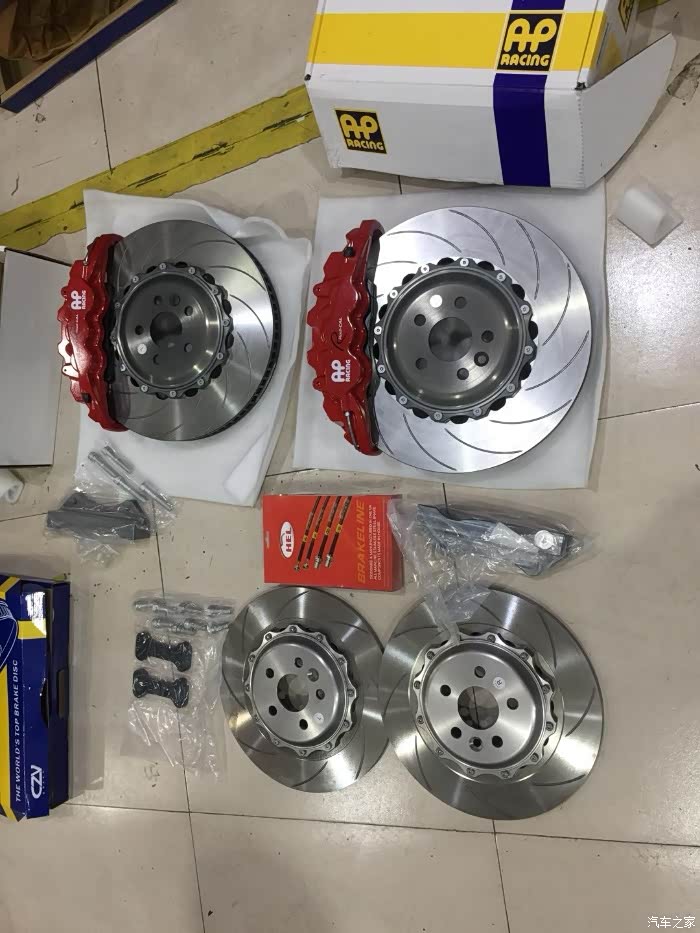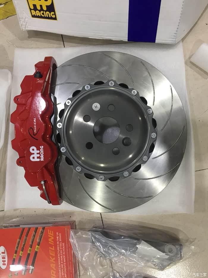 前刹是AP Racing 8520六活塞非对称卡钳,HAWK5刹车皮,碟是390,实际看起来很巨大,用手掂量了掂量,很重很重,不禁担忧对动力的影响问题,毕竟刷ECU不是我近期的计划,后来证明我多虑了,原厂前刹拆下来以后,感觉也很重很重