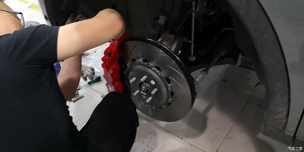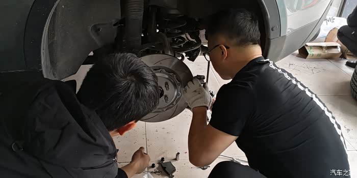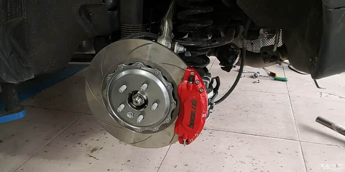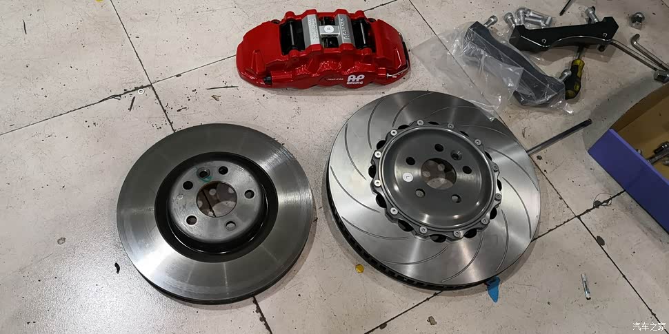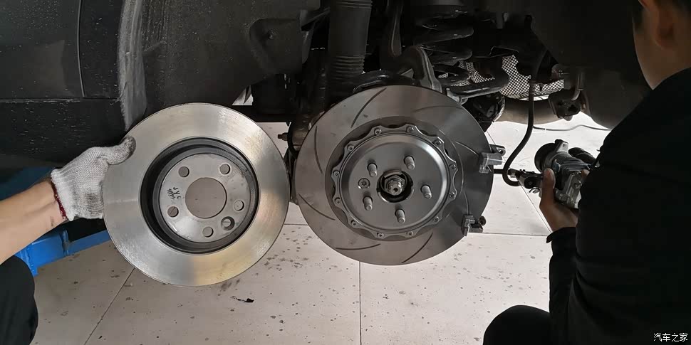换完轮毂马不停蹄前往朋友的改装店,开始换刹车,先从后轮开始,因为不换后轮卡钳,所以不用放油,相对简单,上面图是原车后碟和350碟的大小对比,换过之后原车碟上面的挡泥片需要拆掉,订制的卡钳套可以看出非常合身,以假乱真,当然也有划线碟的功劳。