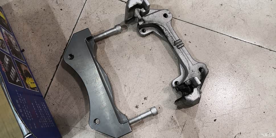 后轮整完开始前轮,先发一个知名钢喉,这东西比较重要,不多赘述,改装锻造桥位和原厂铸造桥位的对比,重量更轻,但强度更高,主要是颜值也高,拆下了原厂前卡钳,可以看标是捷豹的,挺吓唬人,但由于是单向单活塞,刹车片又比较硬,所以刹车脚感并不是很好,这也是我决定换掉的一大原因。