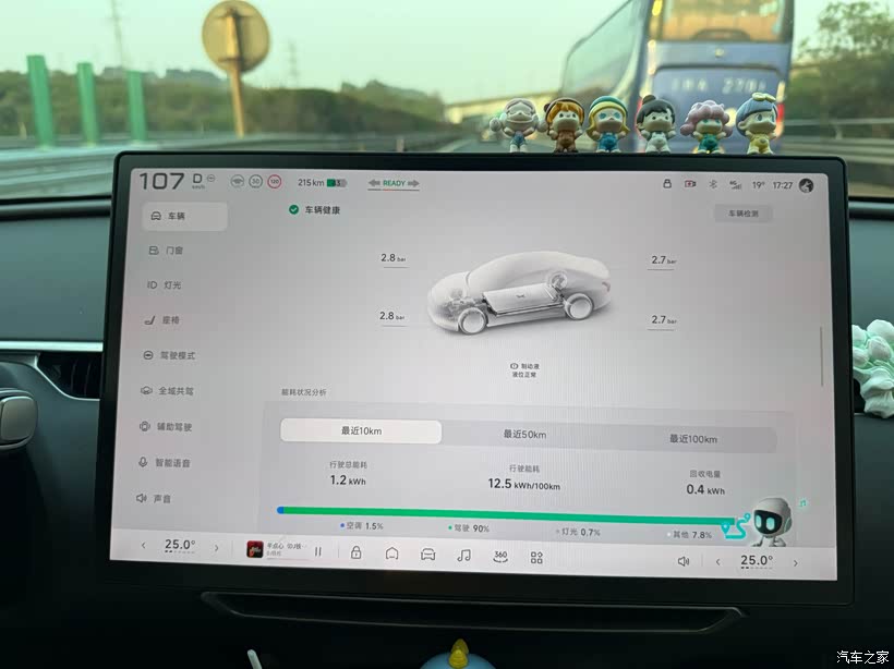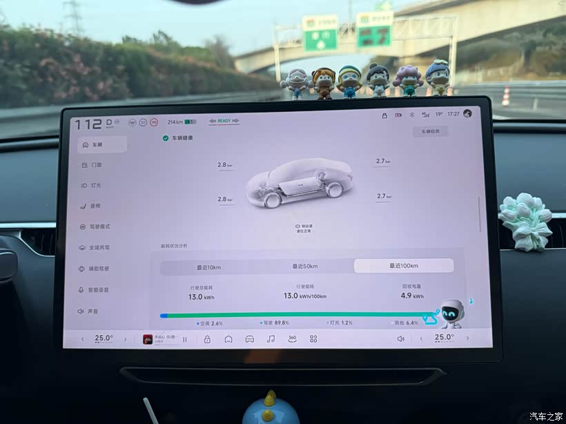 高速表现也很实在。跑100-110km/h的速度,电耗大约12.5kWh/100km,实际续航在450公里左右;如果跑到120km/h以上,电耗会上升到13-14kWh,续航大概打6.5折。但620公里的续航基础摆在那里,跑个400公里也完全够短途出行了。而且快充很给力,30%-80%的电量只需要25分钟,服务区休息一下就能补满半箱电。