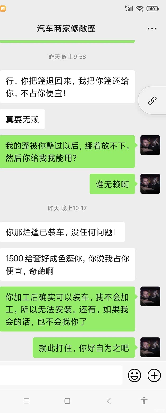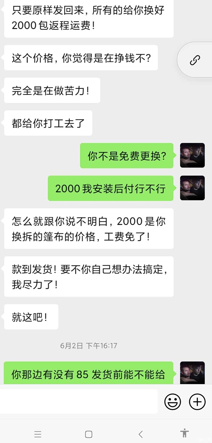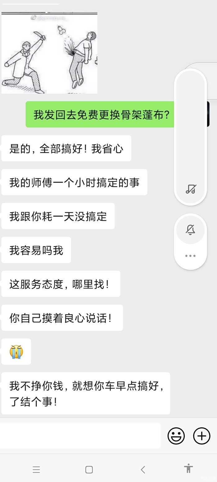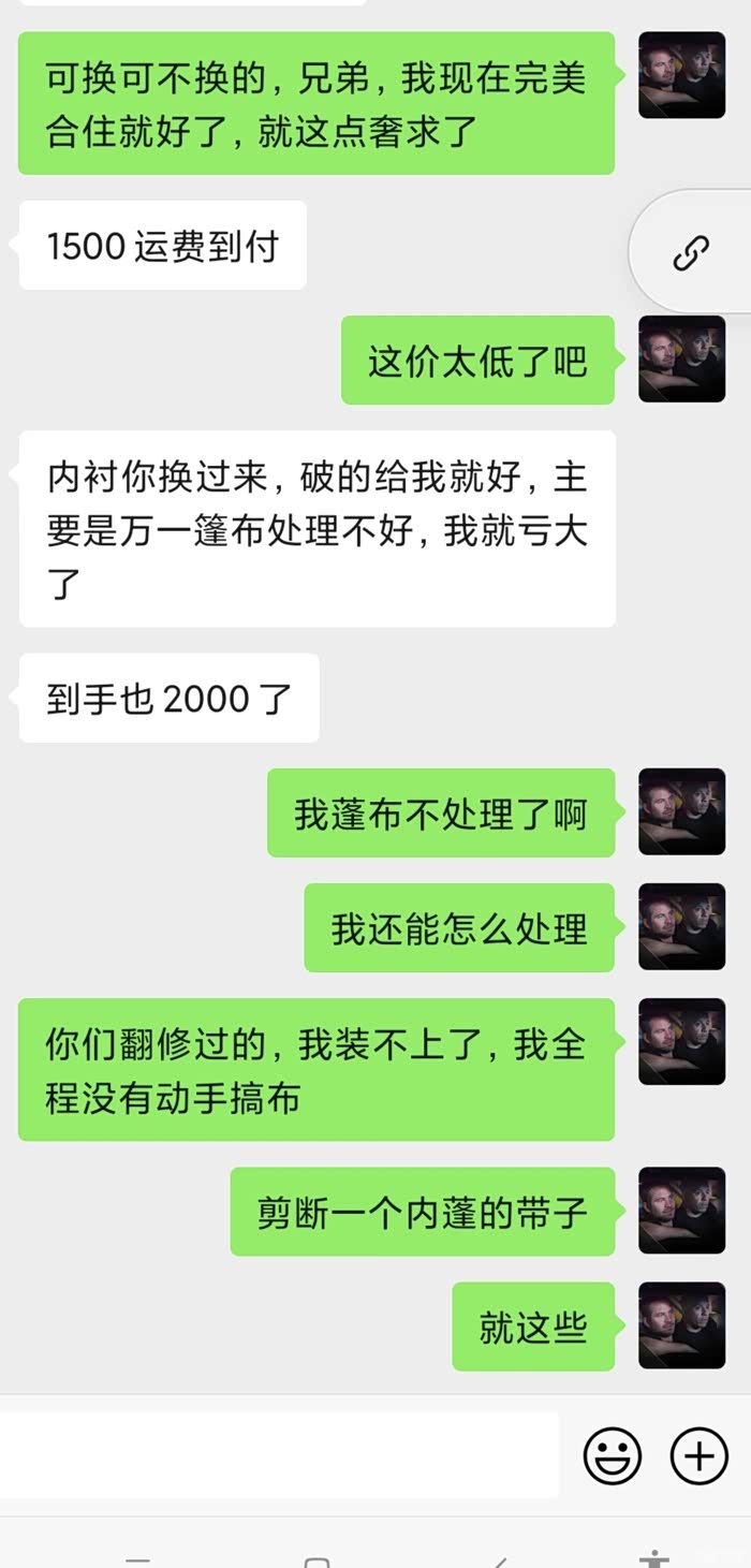 对于大佬,我觉得他左脚踩右脚可以上天的。我原来的篷布没有任何问题,他给将近现在7000元修过以后绷着放不下,现在1500收回去,哈哈哈哈。我真的不想讲太多。我肯定不同意啊。