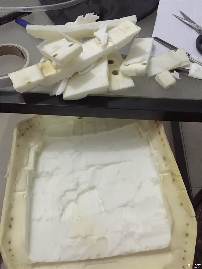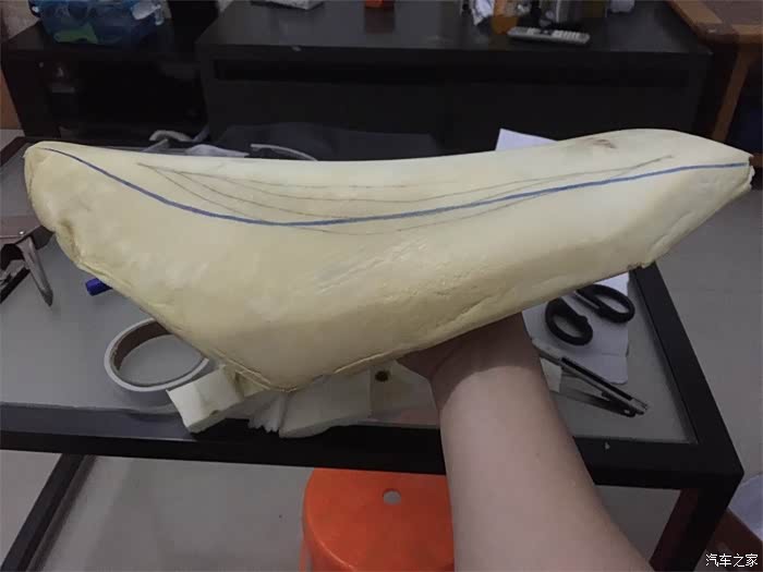 这几天做了蛮多改装,也都表面样子...相信小暴龙车友一直对坐垫设计耿耿于怀,居然是块平板,没有一点设计理念。坐姿不舒服外观不美观,所以也一直想改,但本地汽车装潢部都不提供改造业务!无奈网搜,有家提供可改造可买购的厂家,可买就是新造型买一个,可改就是原车坐垫寄过去削好寄回来,买新怕花钱,改造来去邮寄怕麻烦,改造费也不低!放弃吧,自己动脑子,毕竟我是个服装造型师,对各方面还是有自己的审美以及极强动手能力!冥思苦想吧...脱皮露海绵,画标线,总感觉无论动手能力多强,在没有专业工具的情况下,都不可能削平削出好弧度,风险实在太大,放弃...在手中继续摆弄观察各个角度,终于开窍...具体看面图说...