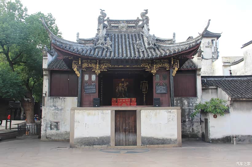 百度:修真观戏台是道观的附属建筑,始建于清乾隆十四年(1749),与修真观一样屡遭毁损。现存为1919年修缮,占地204平方米,北隔观前街与修真观相对,南临东市河,东倚兴华桥。台为两层,歇山式屋顶。底层用砖石围砌,有边门和前门。边门通河埠。底层后部有小梯通楼台,亦可通过翻板门从河埠下到船里。楼台分前后两部分:后部是化妆室;前部是戏台,正对广场。
