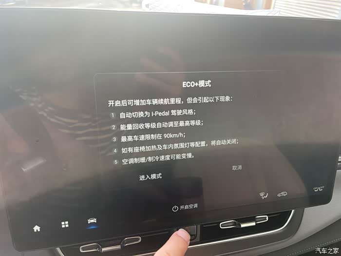eco+相当于极致节能模式,最大限度回收,并控制车内设备用电,这种模式开起来顿挫感很强,人不太舒服。此模式适用于电量见底,附近又无处充电,避免抛锚时使用。