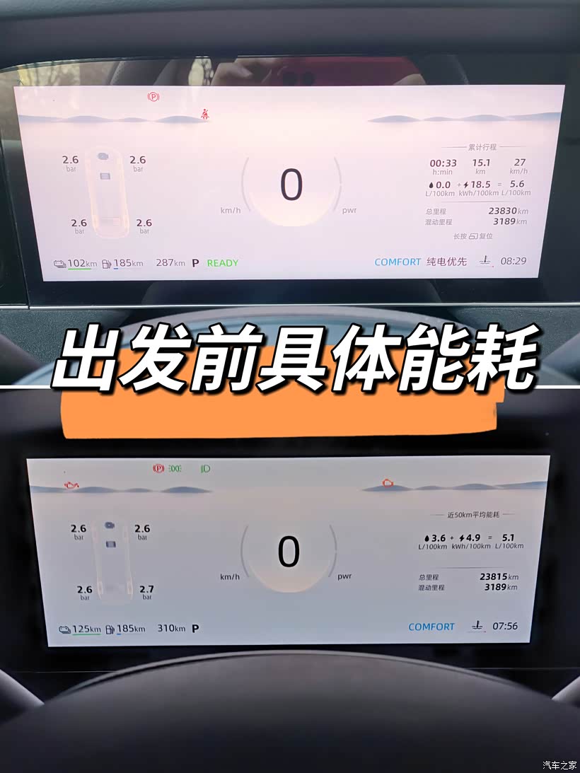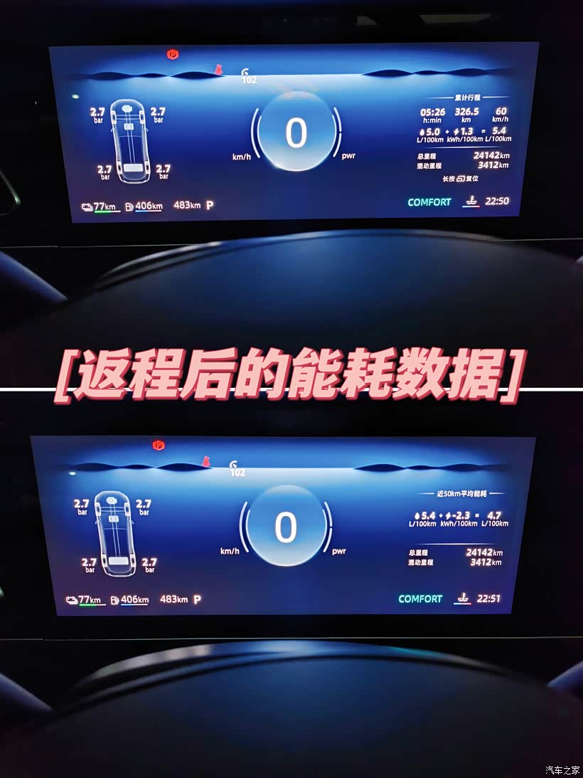 毕竟是跑了一个来回,出发前的总里程为23815km,混动里程为3189km。当时的表显综合能耗是5.6L/100km。回来后的总里程为24142km,混动里程为3412km。当前表显综合能耗是5.4L/100km。最后统计的近50km的表显综合能耗为4.7L/100km。所以,本次行驶的小计里程为327km,混动行驶里程为223km。