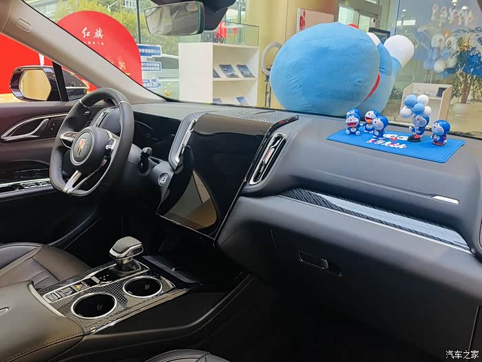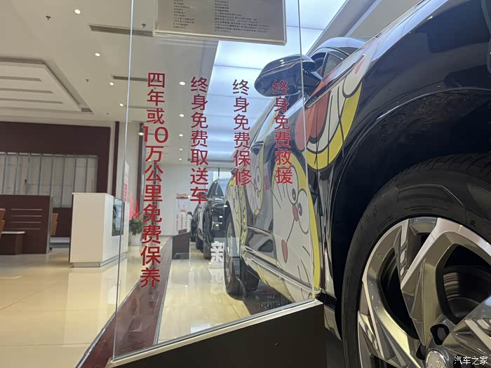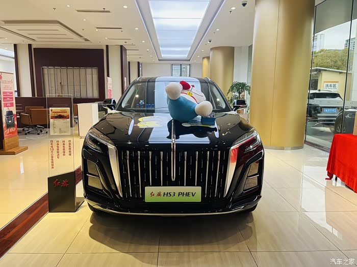 因为性价比高,这辆车是店里的主推款,车身也贴上了可爱的哆啦A梦车膜,不过感觉和这车霸气的外观不太搭啊。车子采用红旗一贯的直瀑前脸,左右分体式大灯进一步拉宽了视觉效果,看上去更有气场。侧面也是经典耐看,流畅的腰线勾勒出修长车身,整体豪华又不失动感。