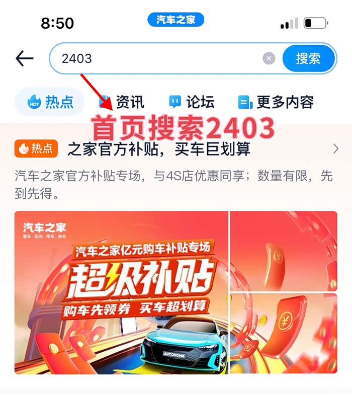 方法2:打开汽车之家App,搜索2403,点击超级补贴