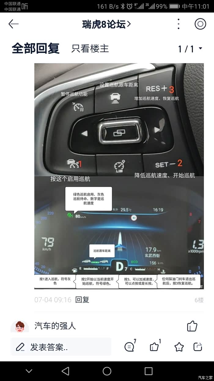 打开左下巡航,然后点右下就可以开始自适应巡航了(车速要大于30km/h),可以自动跟车,保持车距。期间刹车等可以退出(仪表盘上不显示绿色的巡航按钮就是不在巡航模式了)。条件许可的话再按右上的就回到刚才设定的速度再次开始自适应巡航。在巡航状态下按一下右上可以巡航速度加1,按一下右下速度减1,如果是长按的话会升1-5(会先凑个整,然后长按都是5)。其他的可以慢慢摸索