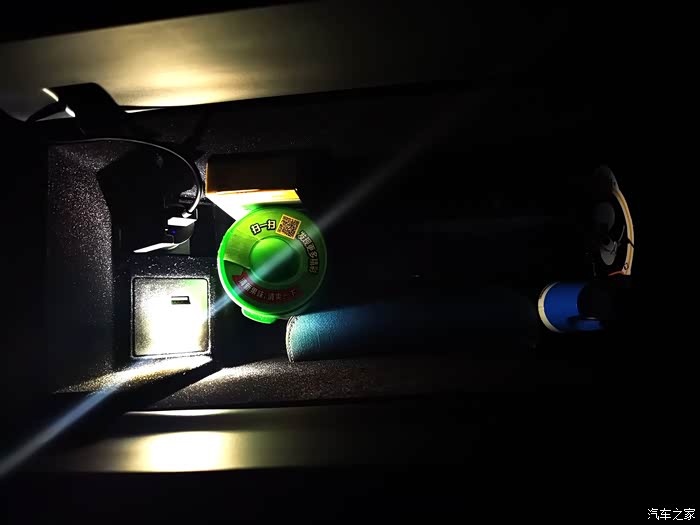 扶手箱里没有电源,我自己加装了后是这样的效果,要不完全是漆黑一片。