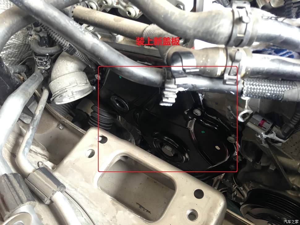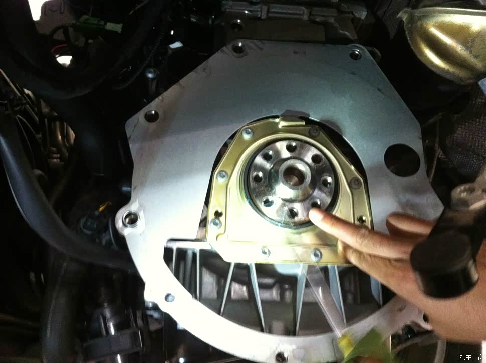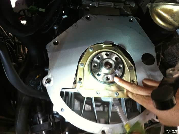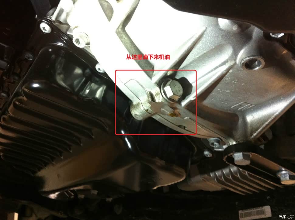 果断索赔,最终查到是下图这个位置的漏了,由于后曲轴油封没密封好导致的。重新拆下打密封胶并且更换所有螺丝就好。看似小毛病,修起来真麻烦,要抬下变速箱发动机和四驱系统,两个师傅配合整整忙了一天,看车新车被大卸八块,真的有点心疼。后来经过论坛上交流,发现那批次的车都有这个问题,通病,后来的批次就解决问题了。