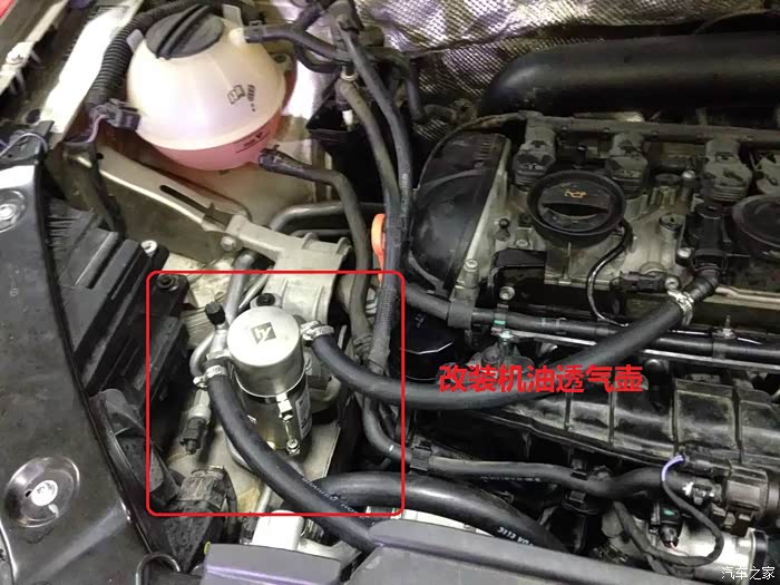 接下来,通过深入的了解后才知道,主要是由于油气分离器无法彻底分离高温油气,导致机油混在废气中再次通过进气岐管端进入发动机燃烧导致,当时只能通过论坛上很多车友的一样办法“加装机油透气壶”,尽量通过机油壶过滤掉一些机油也好,见下图