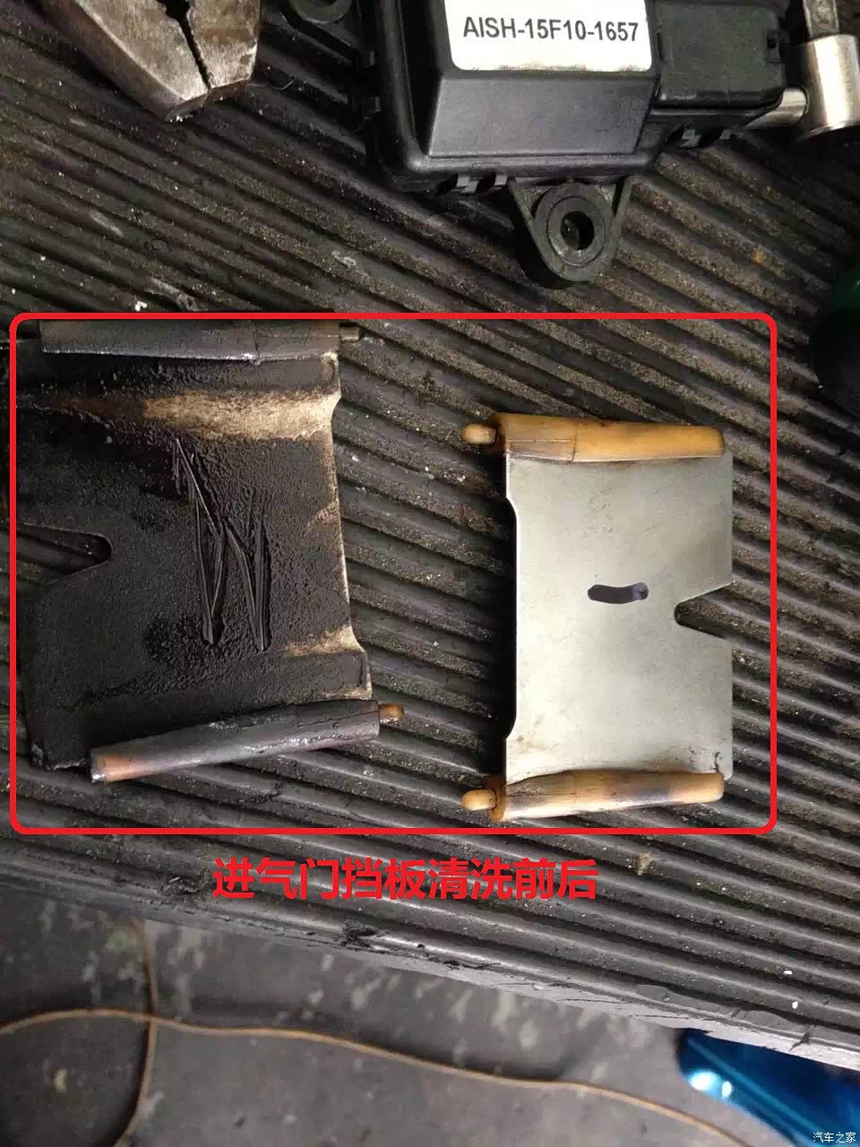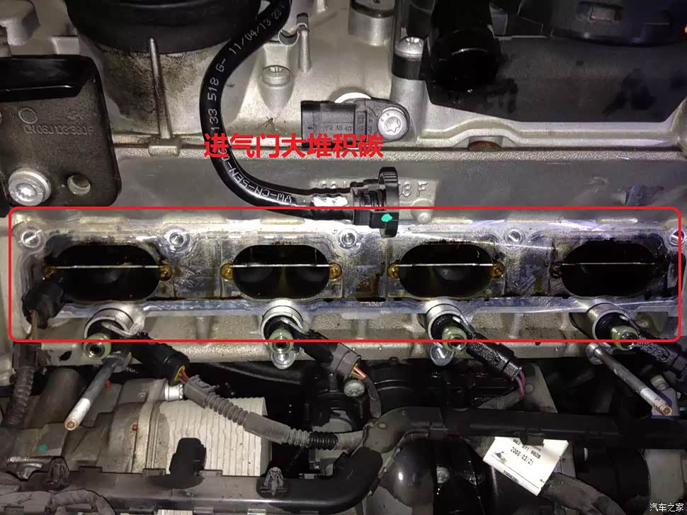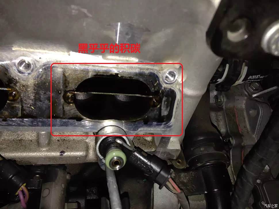经过了这次的维修后,车子后面就几乎再也没出现漏油的情况。直到开了6000公里左右的时候(可能平时高速也跑的少),我发现车子动力越来越差了。然后我就经常使用S档来开,让发动机转速拉高,这是我又发现一个问题,此时S档的动力感觉就像新车的D档的感觉。似乎不太对劲,果断开到维修店检查,维修店给出建议,清洗节气门 进气歧管 喷油嘴,拆开一开吓一跳,大堆黑乎乎的积碳,见下图