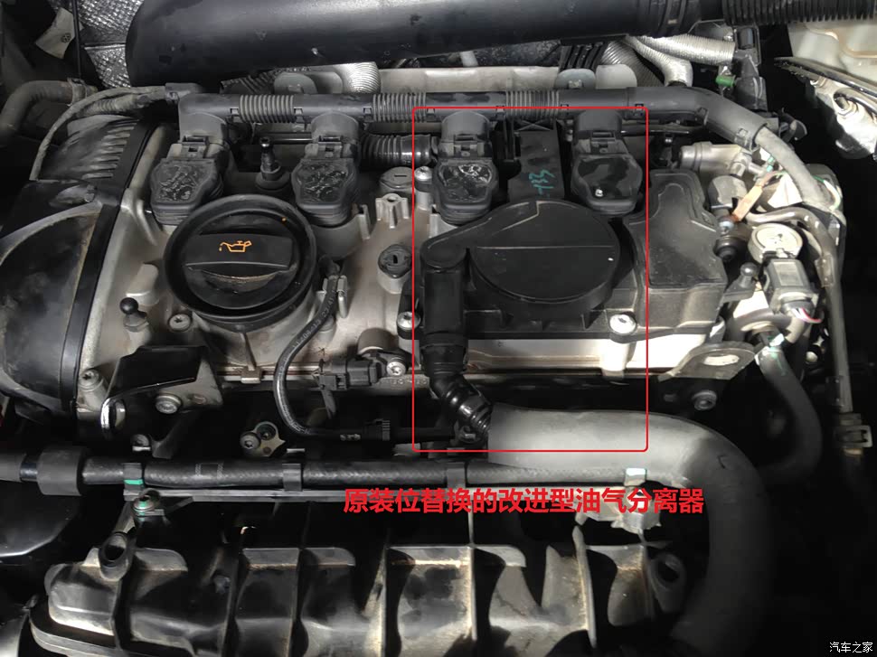 通过用了机油透气壶一段时间后通过观察发现,虽然机油透气壶有效果,过滤掉了大部分机油,但是仍然会有少许机油进入进气歧管,同时还要定期放油,有点麻烦!但是总比没过滤强吧,至少发动机积碳明显减轻了,直到接下来市面上又出现了新的原装位替换的油气分离器。优点是原装位替换,不需要定期放油,油气分离相对机油透气壶更干净。毫不犹豫!!!上市第一时间购买,立即更换,见下图