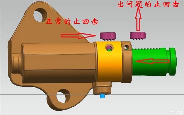 后来通过论坛又了解到,EA888又一个致命的问题是由于正时链条张紧器设计不合理,很容易顶气门,最早是代号06H的涨紧器,06H通过上下两组止回齿条止回,齿条容易磨损后失效顶坏外部包围铁圈,引起顶气门问题,下图引用一张06H涨紧器结构图说明问题,