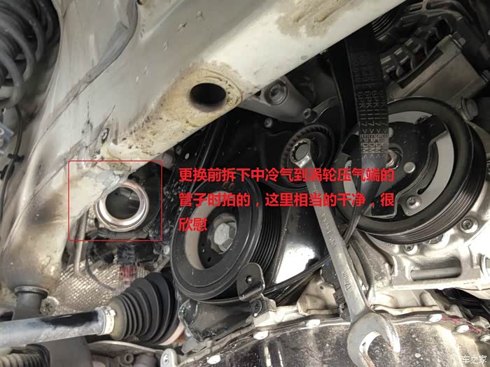 在更换正时链条涨紧器的过程中,拆下了中冷器到涡轮压气端的管子,很多烧机油的车在这段管子里面都有机油。而我的车很干净,很欣慰啊!!!见下图