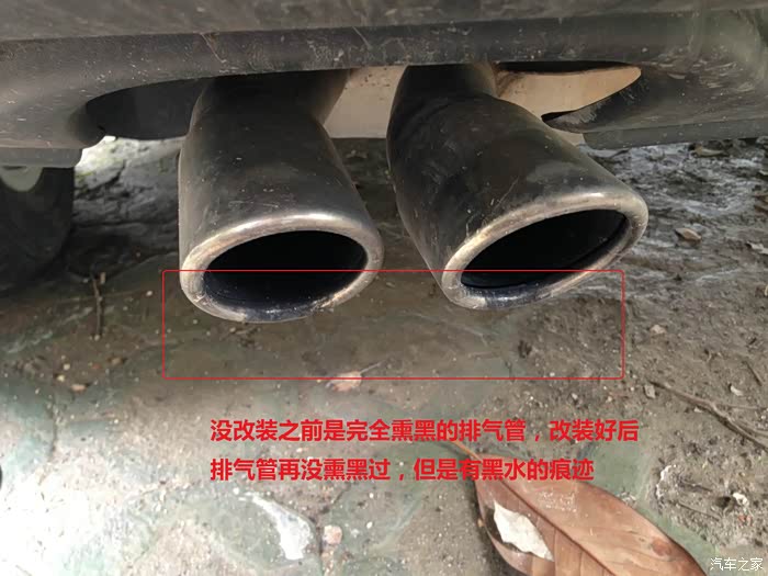 自从这次改好后,持续观察了一段时间。发现在冬天的时候,排气管就经常开始喷水了。排气管喷水就说明燃烧很充分,另外发现以前常常被烧机油熏黑的排气管,现在不熏黑了,而且经常有黑水流出来,油气分离器是在8000公里改的,经过到现在11000多公里,已经开了3000多公里吧。黑水已经越来越少!!应该是排气管喷出的水,冲出排气管原先的积碳吧,下图是排气管流出黑水痕迹的照片