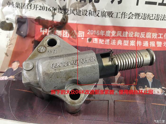 后来大众意识到了问题后,在2013年大约6月份以后的车都改成了代号06K的涨紧器(下图原车拆下的就是06K涨紧器),06K涨紧器相对于06H稳定了很多,主要使用钢丝环止回,但是依然有顶气门的风险,大众官方建议6W公里更换。