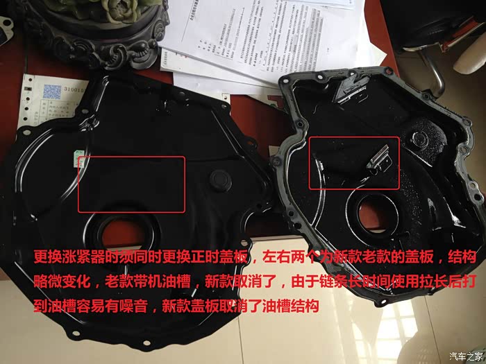 更换涨紧器的时候,拆下正时盖板时很容易撬变形。一般需要更换,但在更换时发现配件不同,发现少了中间的油槽(开始以为配件买错了),吓了一跳啊!后来经过询问了解到,大众后来改进了正时盖板,老款的油槽很大,正时链条拉长后容易打到油槽产生噪音,新款以及第三代的EA888取消了油槽设计,具体见下图对比,也能在此给其他未来需要更换涨紧器的车友提个醒,放心!!!配件没买错!!!