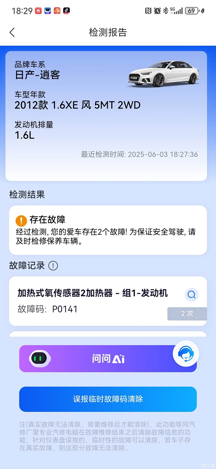 看到没有,虽然换好了新的前氧传感器,但检测出来的故障码还在,组1是前氧传感器,故障码P0141,组2才是后氧传感器,点下误报临时故障码清除就可以了,清除后着车仪表盘上就没有故障码显示了。检测出来相关问题不懂可以直接问AI很方便!