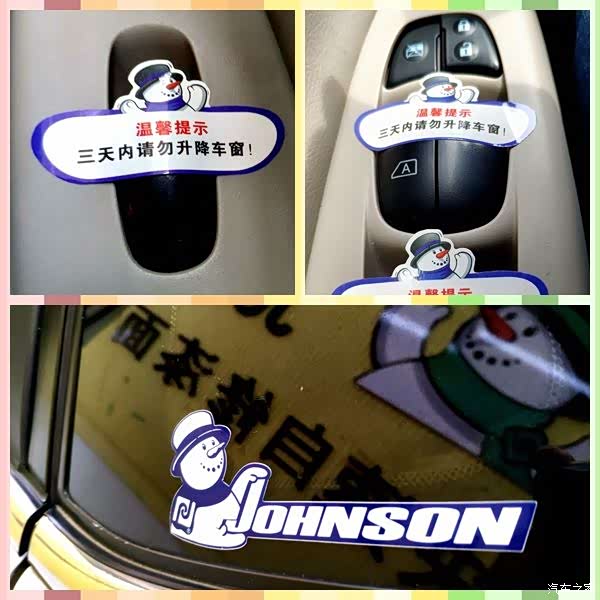 4.妥妥善善做收尾。贴膜施工完成后,在各车窗控制按键上粘贴暂不升降车窗的提示,并人工锁闭车窗升降开关。同时,在侧后小窗粘贴强生标识,以表示该汽车为施工完毕汽车。