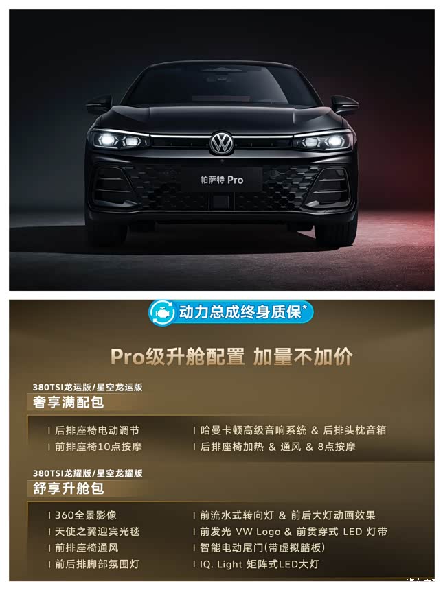 随着新能源车的兴起,作为消费者,大家越来越看重汽车的智能化配置和舒适化配置。而这些帕萨特Pro都有了,这次380龙运版将奢享满配包免费赠送,其中包含哈曼卡顿音响和后排头枕音响、后排座椅加热、通风、按摩、后排座椅电动调节以及前排座椅按摩统统做成了标配,等于免费赠送,价格为19.99万元!我觉得这个配置已经达到了顶配的标准。
