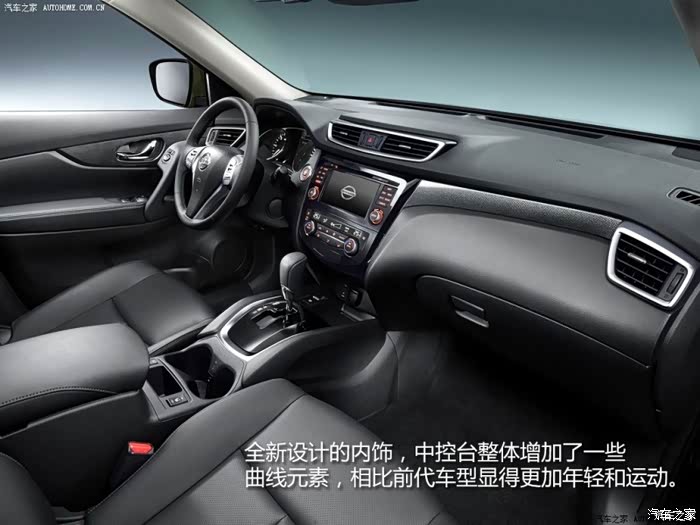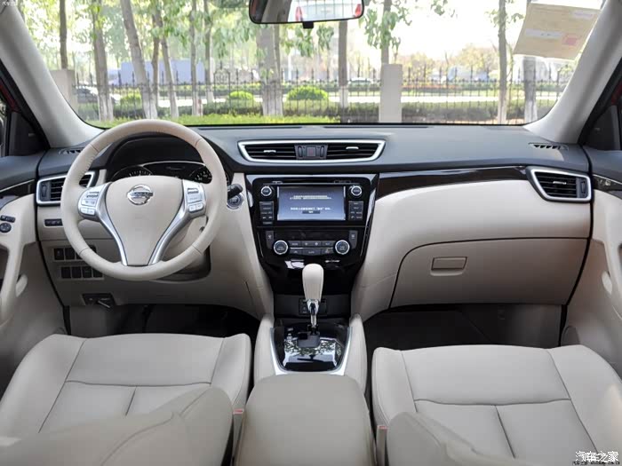 第二代X-TRAIL的内饰设计也与逍客极为相似,但为了体现奇骏更纯粹的越野风格,细节部分的处理显得更加硬朗,如圆形空调出风口变为四边形,中控台面板两侧则加装了亚光金属饰板,让内饰看上去更富运动气息。前代车型的中央仪表移到了驾驶员前方,三辐式方向盘的造型与逍客上的完全一样,亚光银饰板的衬托体现出质感,多功能按键也比较齐全。因为两车为同一平台所以零件大部分都能通用。