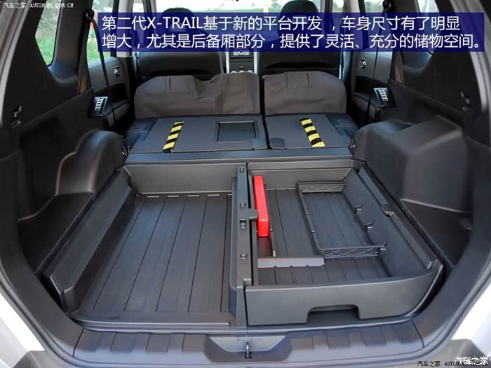 第二代X-TRAIL在驾乘空间部分的表现与前代相仿,车长的增加主要体现在后备厢向后伸长了127mm,对应的载物空间比上一代增加了193L,达到603L。后备厢地板还采用了创新的双层式设计,上下两个抽屉可以将不同类型的物品放置其中,从而提高了实用性。