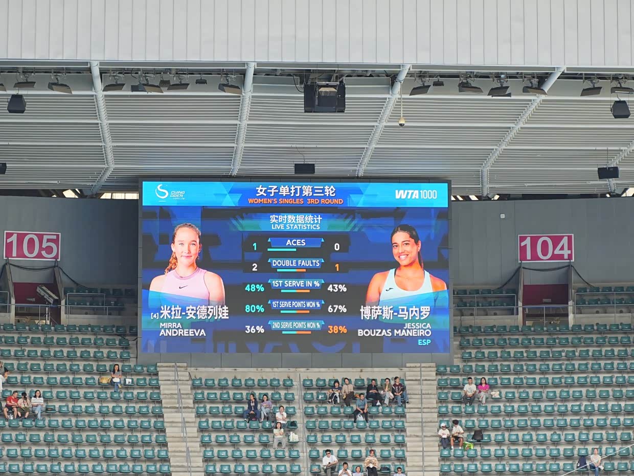 进入比赛现场的时候,比赛已经开始,米拉.安德列娃的对手是西班牙以进攻犀利著称的博萨斯.马内罗。俩人你来我往从场面上看马内罗攻势不断,每次击球都要大喝一声,而安德列娃则通过稳健防守,迫使对手不断失误最终拿下赛点。接下来分享几张精彩片段。由于赛场禁止带入105MM以上长焦镜头, 也只能尽力而为了。