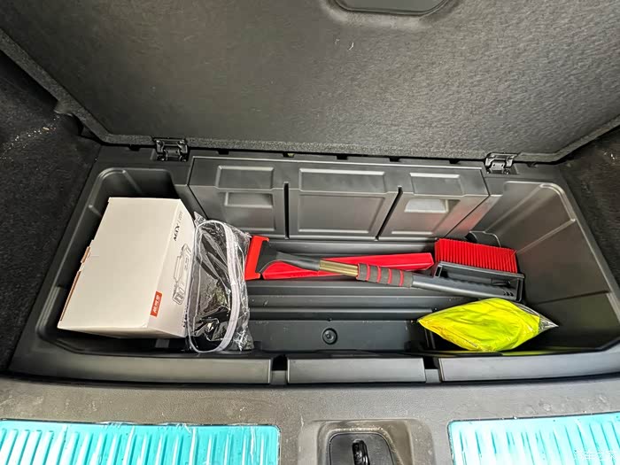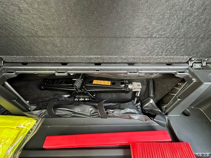 在它的后备箱底部有一个储物暗格,平时放把遮阳伞,手电筒等小型工具还是可以的。在它的暗格内部放有三脚架,千斤顶,以及各种卸轮胎的扳手,依靠这些东西拆下一个轮胎不成问题,工具颇为齐全。但为了以防万一我还特意准备了一个充气泵,哪个轮胎没气充哪里,so easy!