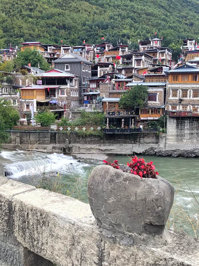 隧道堵车,绕路一到小村庄,塔旁有寺。