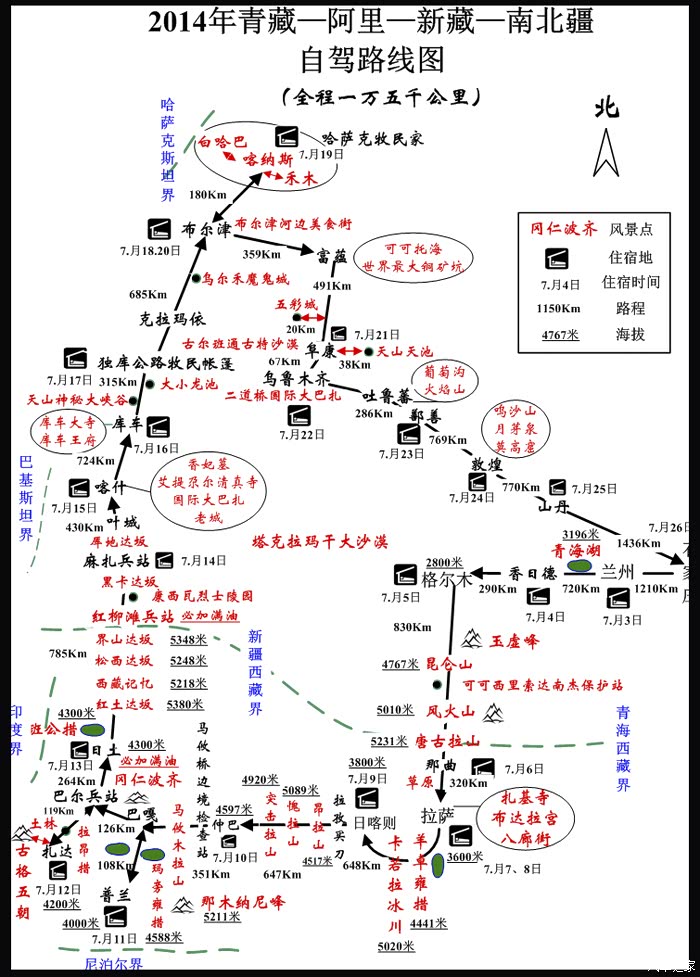 2014年暑期,从青藏西线进藏,弥补2011年走青藏线时因夜晚过那曲草原没能一览美景的遗憾,然后走阿里南线领略向往已久的藏地秘境—阿里的风光,向北沿新藏线219国道到达南疆,经喀什、库车、独库公路到达北疆,再经克拉玛依至喀纳斯,向东经富蕴可可托海沿216国道南下至天山天池,从乌鲁木齐沿连霍高速返回,顺路浏览吐鲁蕃、敦煌。行程一万五千公路,是多年自驾游单程最长的一次。