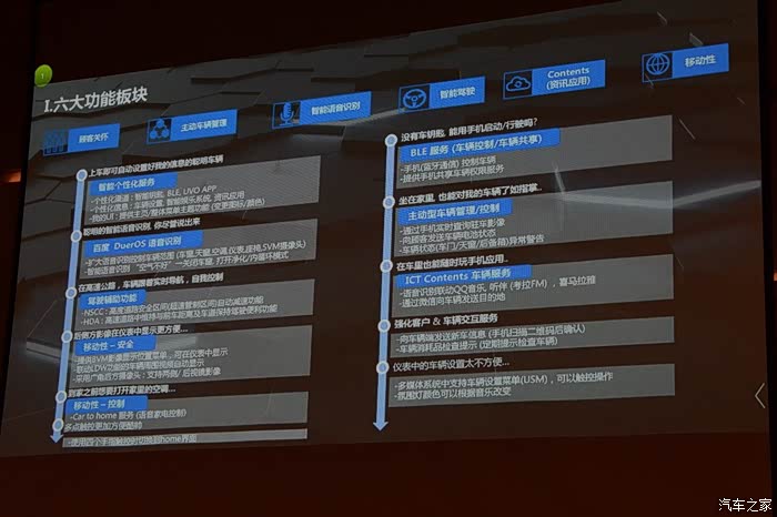 全新一代起亚K5凯酷(以下简称起亚K5凯酷)具备顾客关怀、主动车辆管理、智能语音识别、智能驾驶、Contents(资讯应用)、移动性等6大功能板块。