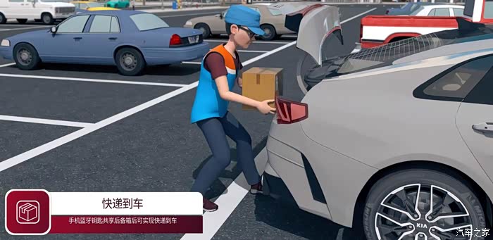 如果有快递要接受,你可以通过将手机蓝牙钥匙共享后备厢给快递员,这时快递员就能单独开启起亚K5凯酷后备厢,把快递放进去,还可以联动SVM查看停车位置实景,检查是否放好快递,或者是关好后备厢。