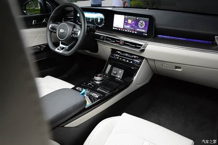 进到车内的第一感觉就是高级,内饰整体质感和用料相比上一代K5有了非常大的提升。两块12.3英寸的屏幕、多色可选氛围灯、旋钮式换挡、手机无线充电等等细节,都在烘托新车的科技氛围。哎我天,嘴里不由的说了句有钱真好。