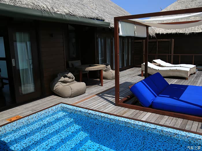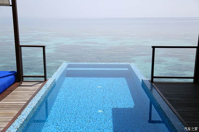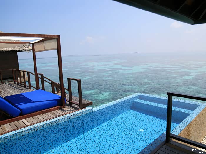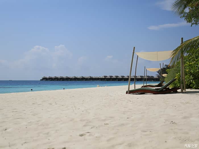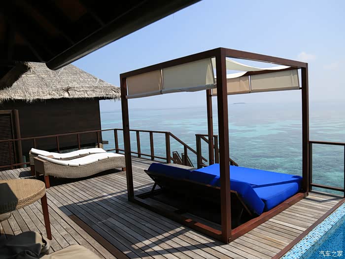 豪华和超豪水在岛屿的登岛一端,这个海上总统别墅是单独在岛的另一面,非常隐私,浮浅也很好~房子超大,据说有200平米。不光有私人管家,洗浴用品也和我们之前在沙屋的不同,从牙膏到身体乳洗浴品清一色的都是帕尔玛之水。之前在沙屋的都是没牌子的。因为看到是一次性的,而且每天小黑都把没用完的给我们换成新的,所以回去时候和拿了几个,请原谅我穷人的气质。