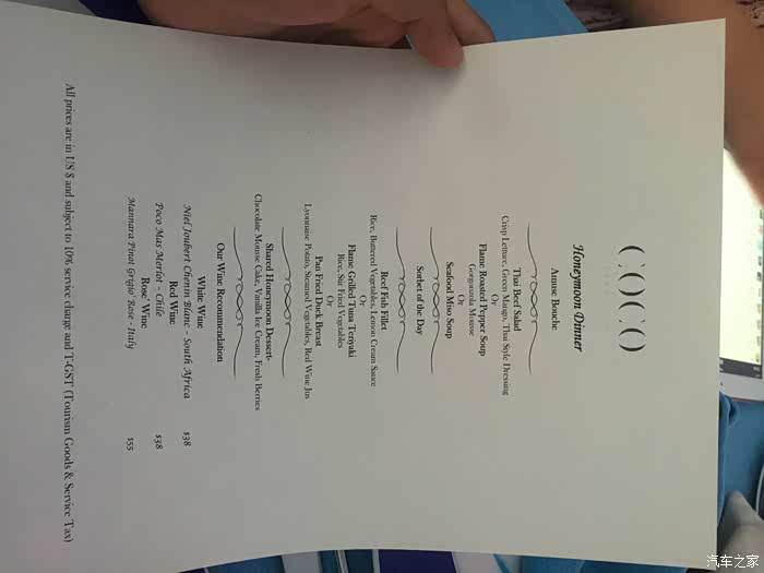 这是蜜月餐的菜单 2选一 看不懂 选择了中间的 因为看到了FISH和DUCK 我是肉食动物