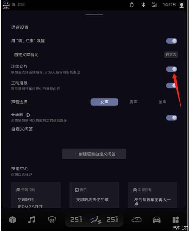 红旗HS7开启连续交互的方法如下: