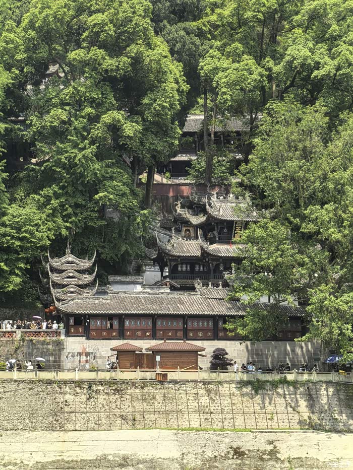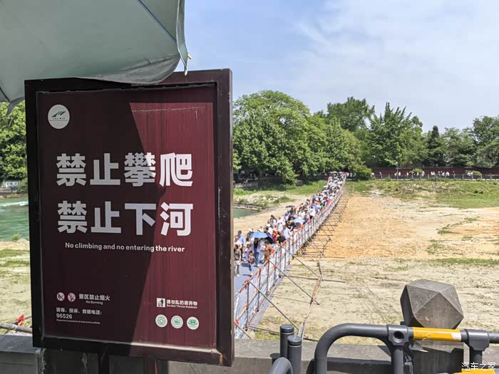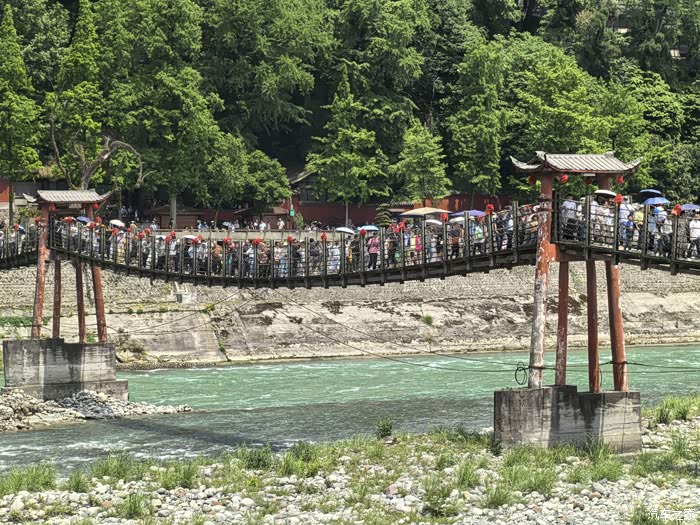 穿过安澜索桥,脚下江水奔涌,桥身轻晃引得游客惊呼连连。