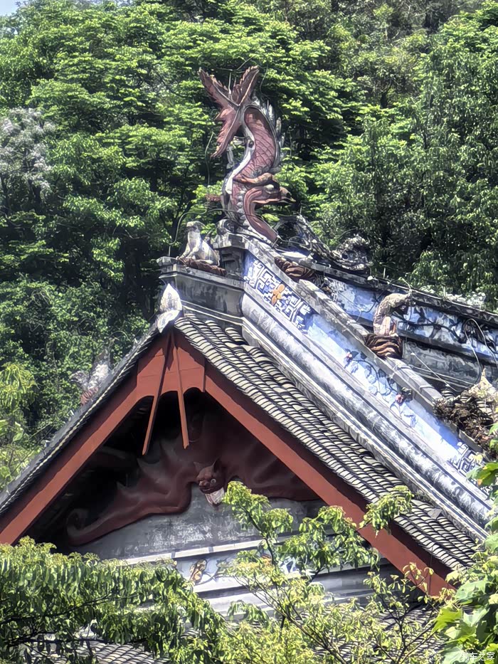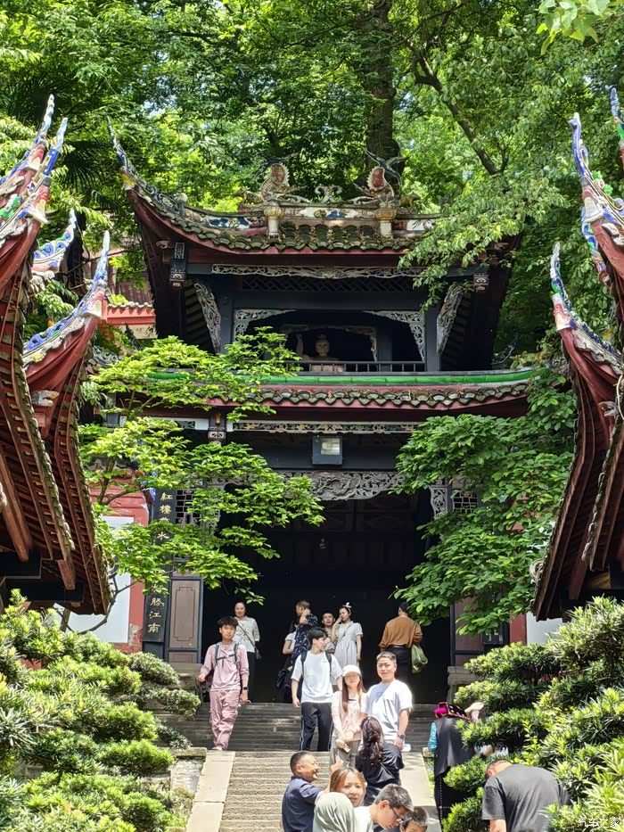 行至二王庙,古柏森森,香火缭绕,殿内壁画讲述着李冰治水的传说。