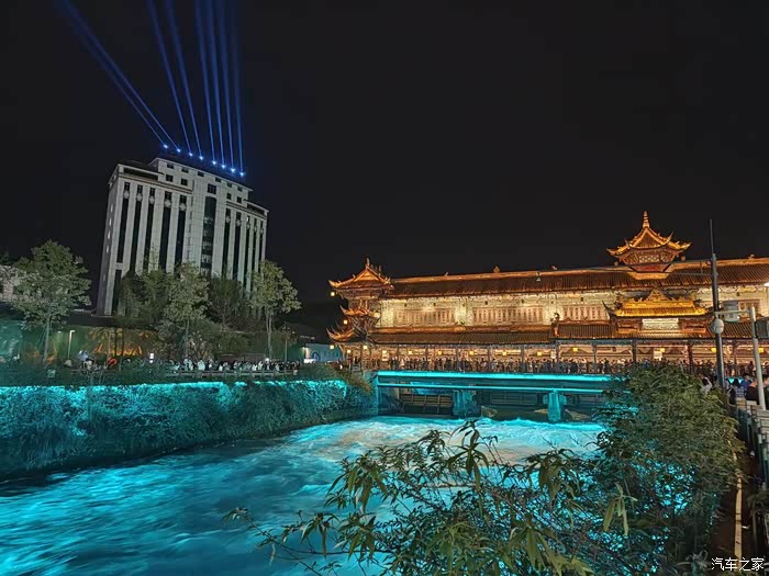 当夜幕降临,岷江水面在灯光映照下泛起蓝绿色光泽,宛如流动的“蓝绸带”,又似繁星坠入凡间,营造出如梦似幻的“蓝眼泪”效果,为这座千年水利古城增添了神秘与浪漫。