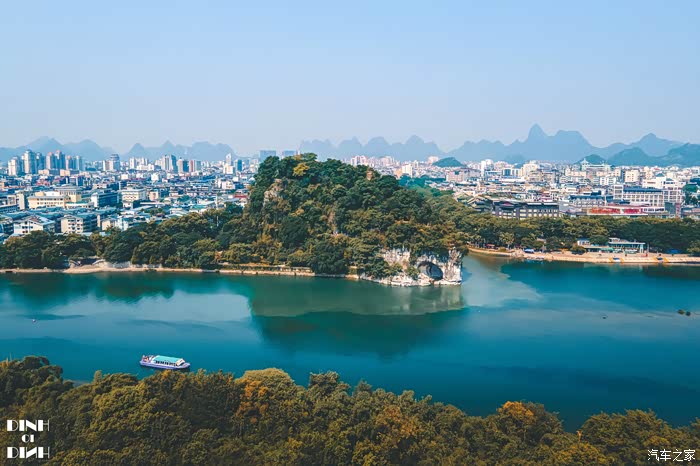 杉湖的背后就是漓江,漓江的背后就是訾洲岛咯。以整座岛都是生机勃勃的绿色点缀着红黄。