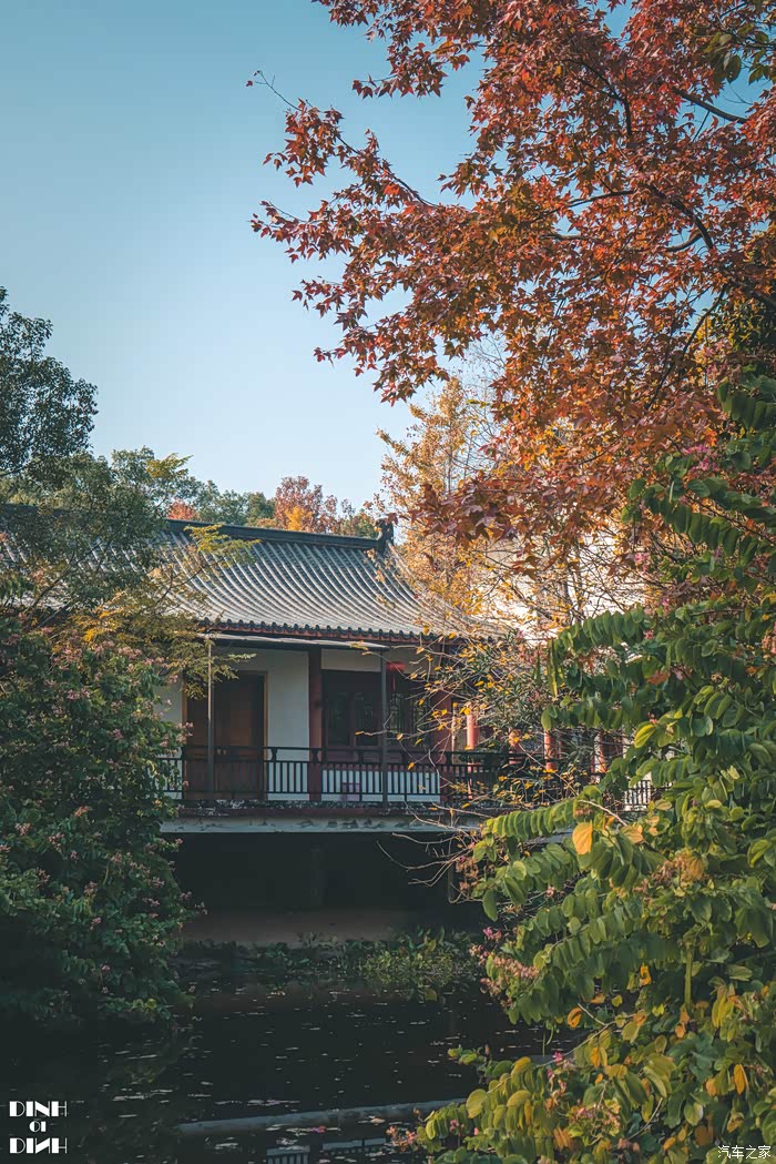 【烟雨湖】进入景区先不乘电瓶车,过了入口的桥下桥后一直走,就到了烟雨湖,这里是訾洲岛的一个秘密小众拍摄地,红枫这里也不少,还有古色古香的仿古建筑,